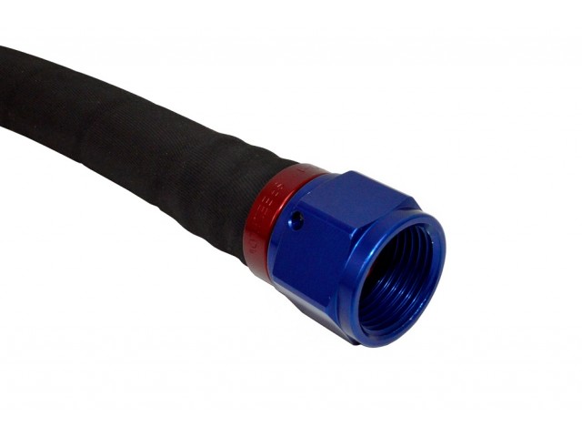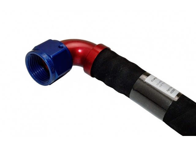 Oil cooler outlet to tank top oil hose to suit left hand drive Seven 485 CSR. Hose has one 90° and one straight fitting.