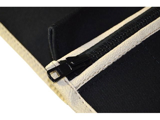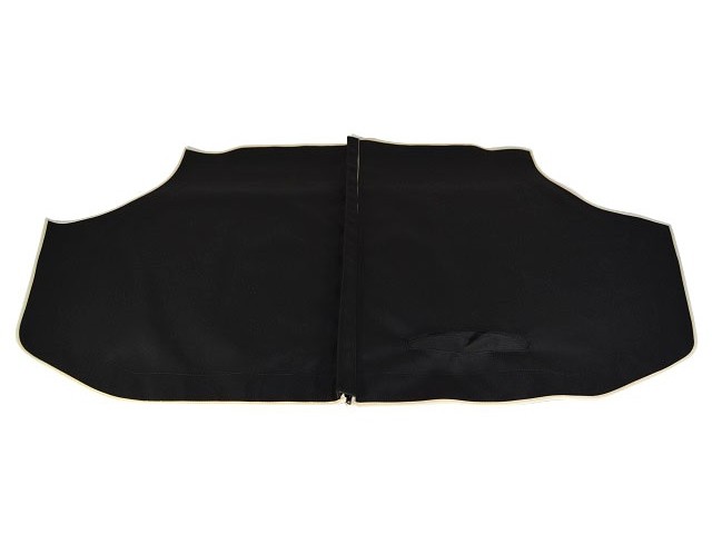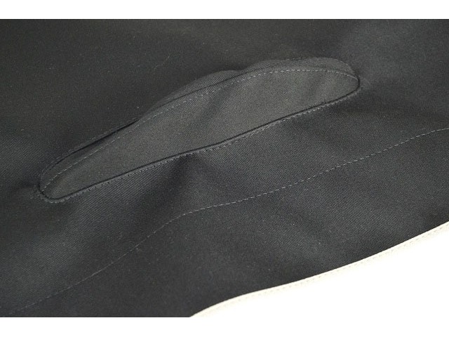 Left hand drive Supersprint Tonneau cover, fits hood sticks. Black Mohair with white piping.
